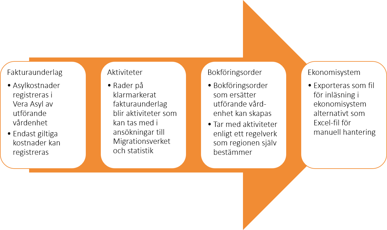 För de regioner som önskar finns det möjlighet att automatisera flödet från fakturaunderlag till bokföringsorder. När fakturaunderlaget klarmarkerats, kan Vera Asyl automatiskt skapa bokföringsorder som sedan exporteras för vidare hantering i regionens ekonomisystem. De automatiska funktionerna gör att behovet av manuell hantering i ersättningsflödet minimeras.