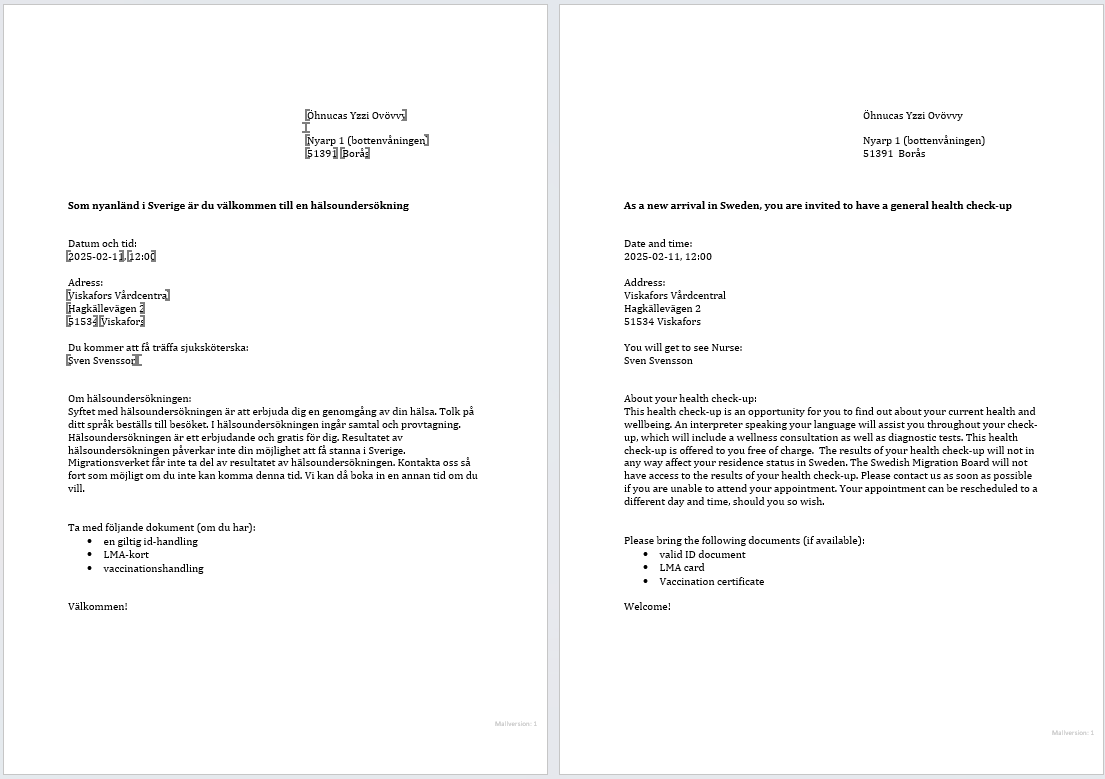 Kallelse till hälsoundersökning och tandvårdskontroll anpassas automatiskt till talat språk hos patienten. Varje kund har möjlighet att använda sina egna mallar.