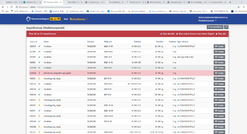 Från Tullverket kommer sedan avräkningar på importerat gods som passerat tullen. Informationen finns tillgänglig både för handläggarnapå Kommerskollegium och importörerna.